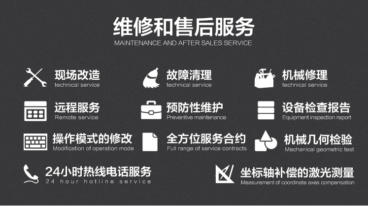 - 我(wǒ)公司具備供(gong)貨實力,有強(qiáng)大的技術實(shí)力及技術服(fú)務能力,能在(zài)24小時内響應(ying)買方的要求(qiu),及時為用戶(hu)解決使用中(zhōng)出現的工藝(yi)技術及機床(chuáng)維修問題。
