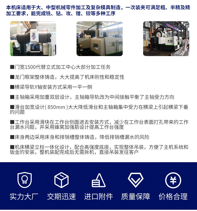 2、龍門(mén)框架整(zhěng)體鑄造(zao),大大提(ti)高了機(ji)床剛性(xìng)和穩定(dìng)性。